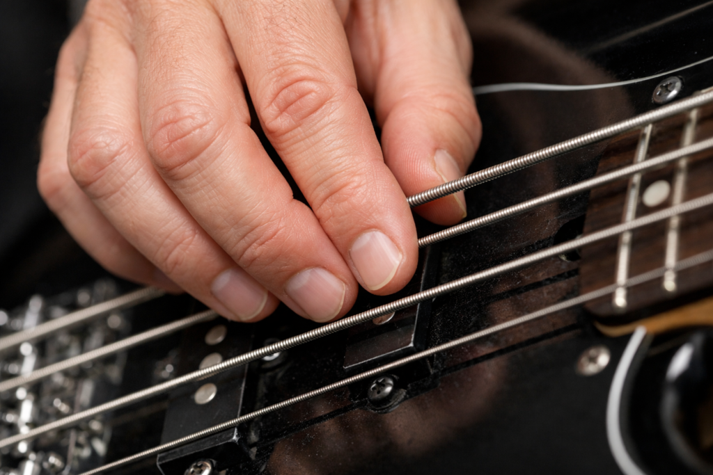 ベースは弦が太く振動が大きいため、弾いていない弦が共振して余計な音が鳴りやすい楽器です。不要な音をミュート(消音)する技術は、クリアなベースサウンドに不可欠です。
